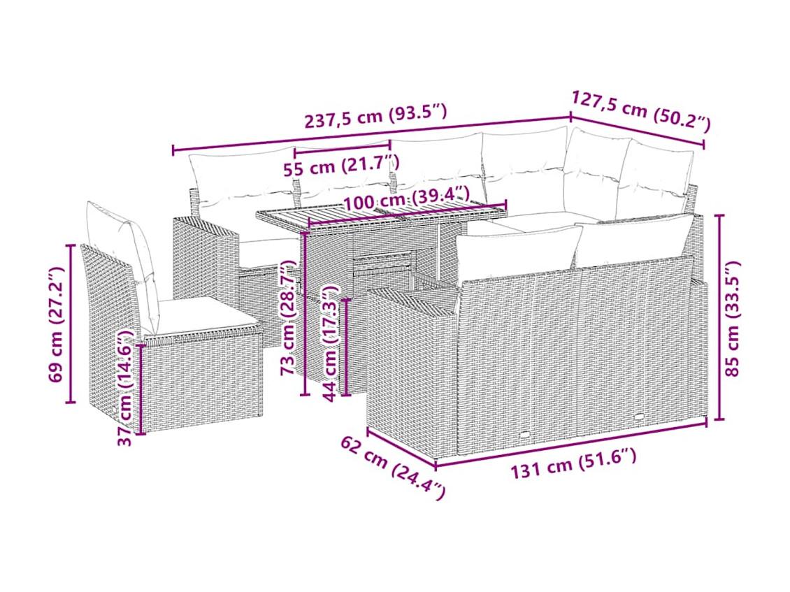 Salon de jardin avec coussins 9 pcs beige résine tressée