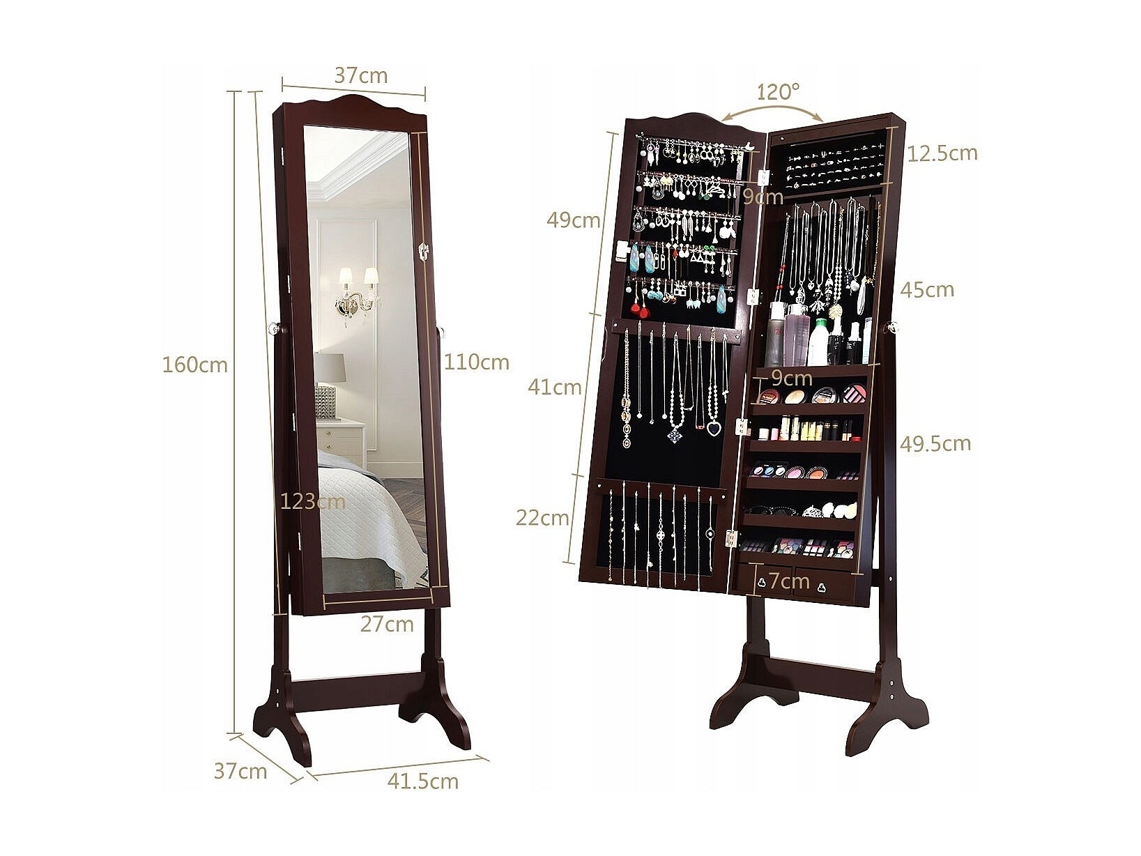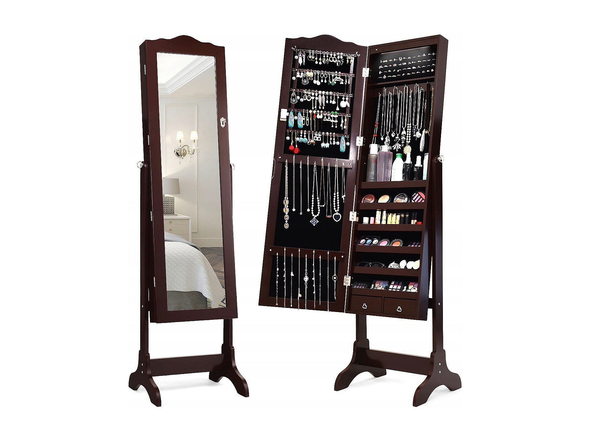 Schmuckschrank mit 14 LED Leuchten & Ganzkörperspiegel Schmuckregal Spiegelschrank Braun