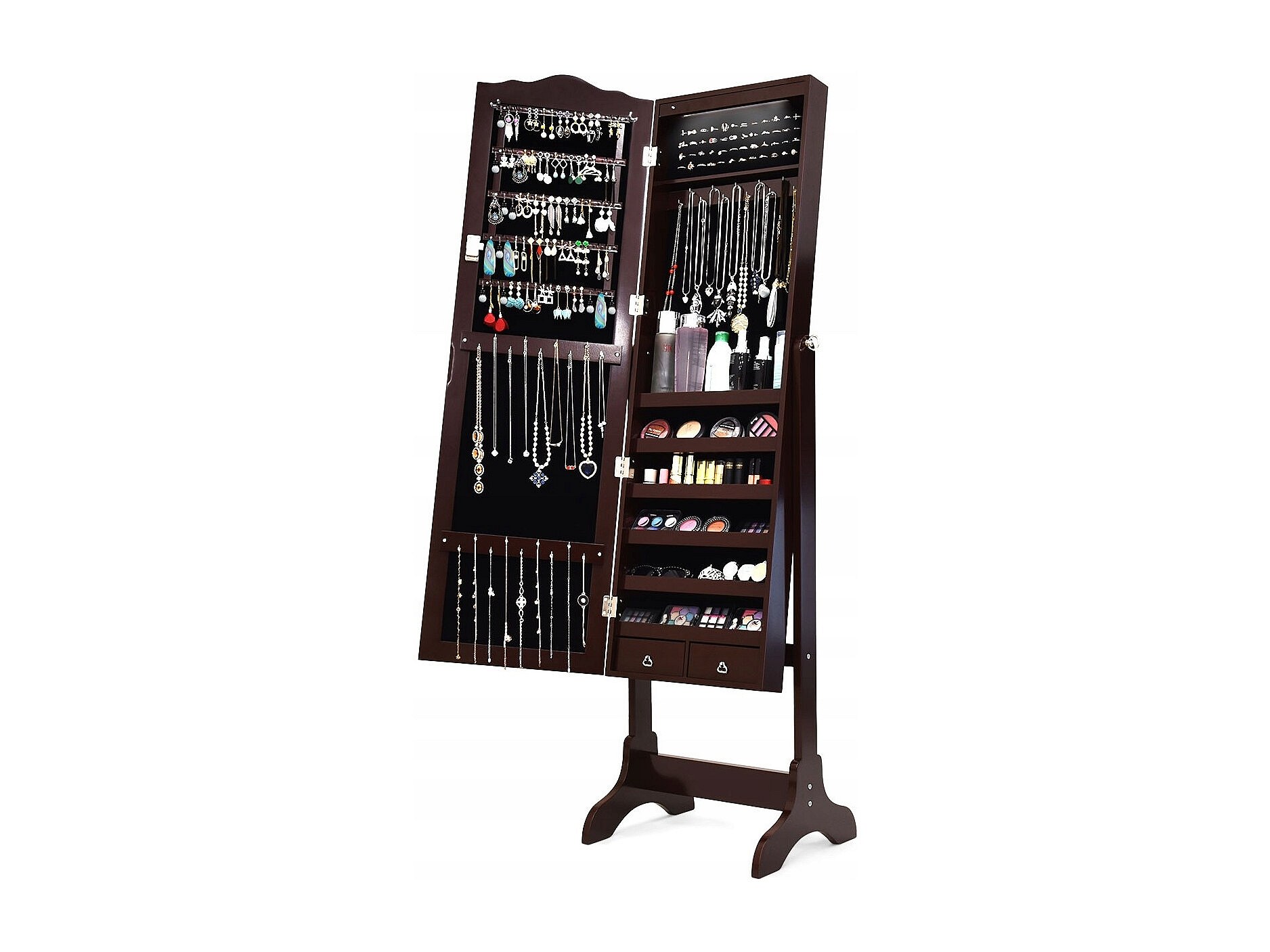 Armoire à Bijoux sur Pied SucceBuy Rangement Complet Marron, Doublure en Velours, LED, Tiroir, Longueur Totale, Brun, Organisateur Autonome