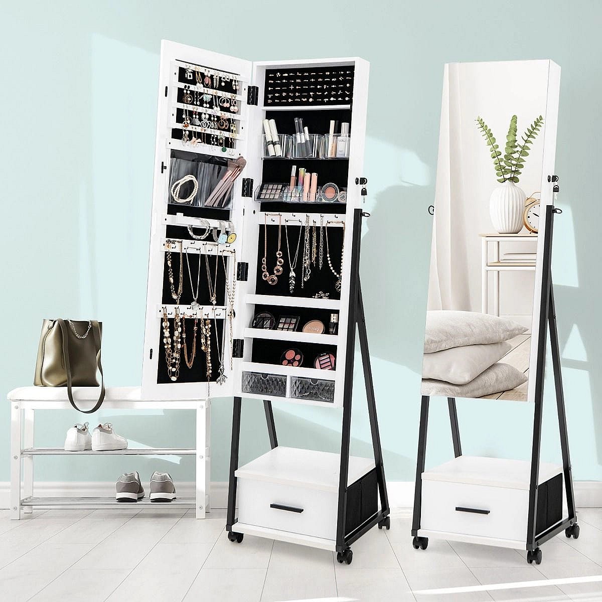 Abschließbarer Schmuckschrank Stehendes Design mit verstellbarem Winkel mit Ganzkörperspiegel 45 x 37 x 160 cm Weiß