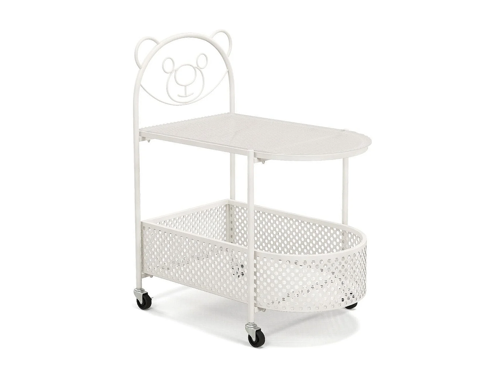 Table Basse Mobile en Verre Table d'Appoint à 2 Niveaux avec Motif Ours Panier de Rangement Cadre en Métal Roulettes Verrouillables Blanc
