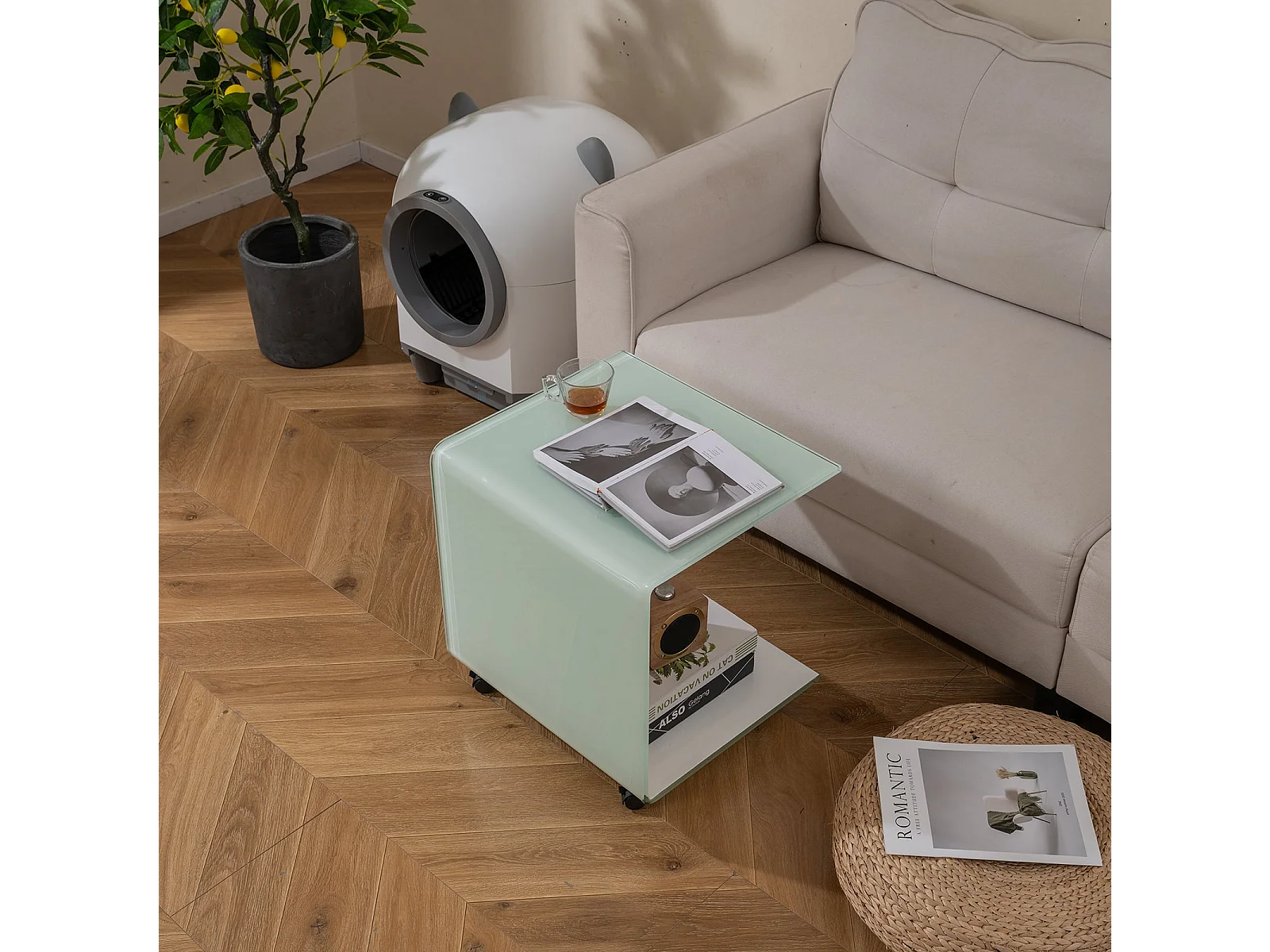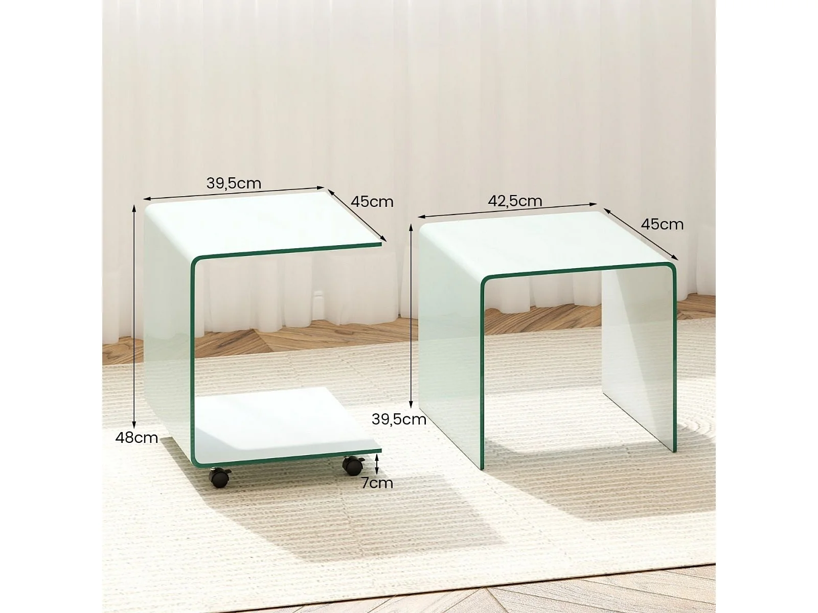 Table d'Appoint Latérale en C en Verre Trempé avec Étagère à 2 Niveaux & 4 Roulettes Pivotantes Verrouillables 40 x 45 x 48 CM Blanc