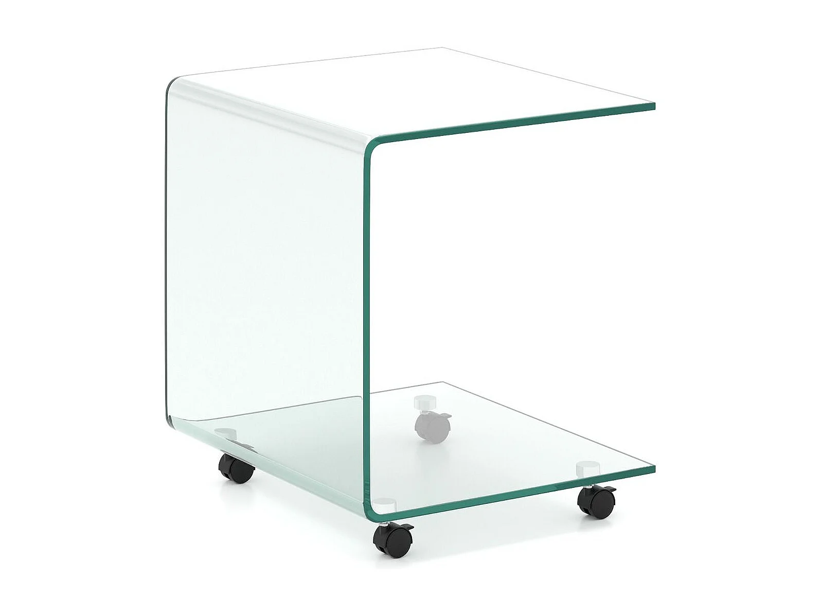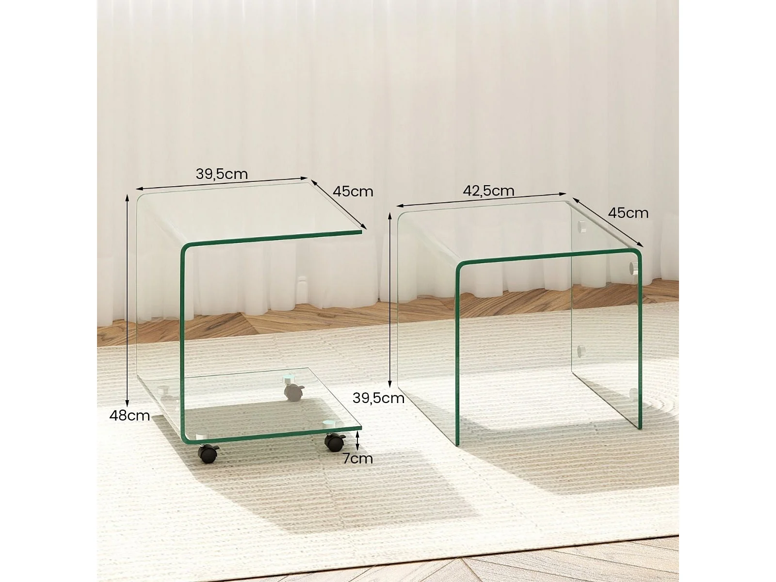 Table d'Appoint Latérale en C en Verre Trempé avec Étagère à 2 Niveaux & 4 Roulettes Pivotantes Verrouillables 40 x 45 x 48 CM Transparent