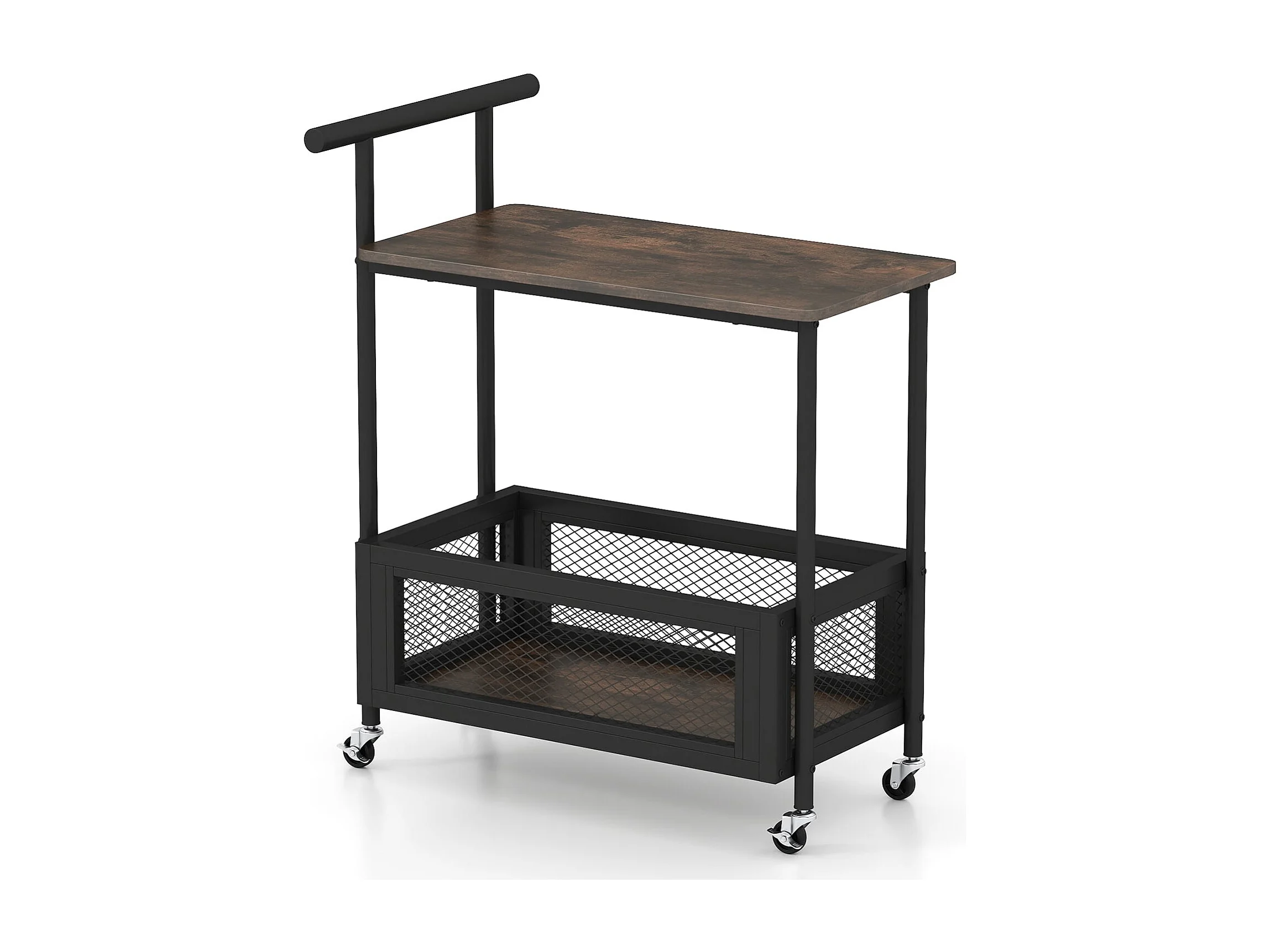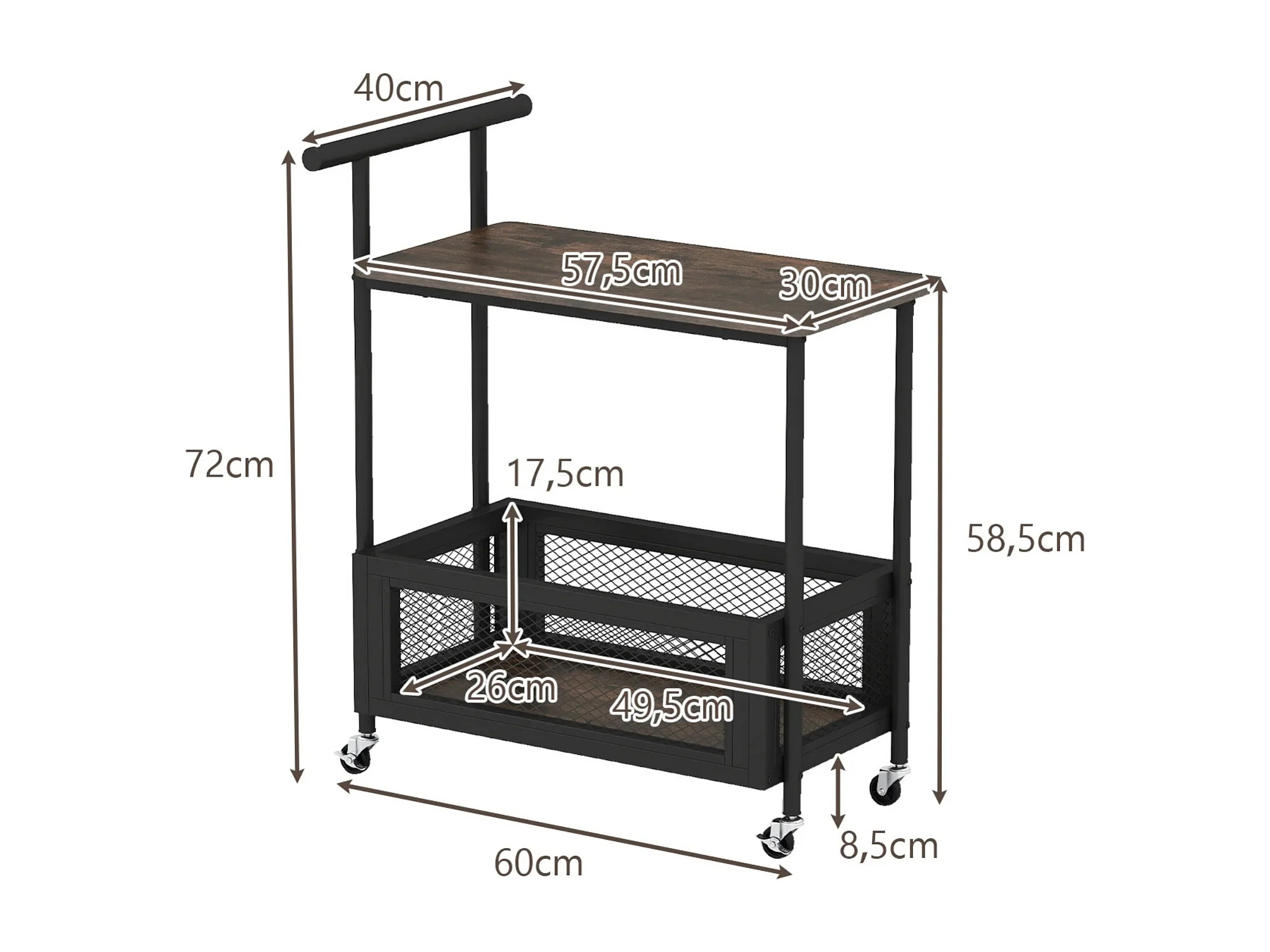 Table d'Appoint Roulante avec Poignée Table Canapé à 2 Niveaux avec Étagère Ouverte&Panier en Maille Chariot de Rangement Polyvalent Marron