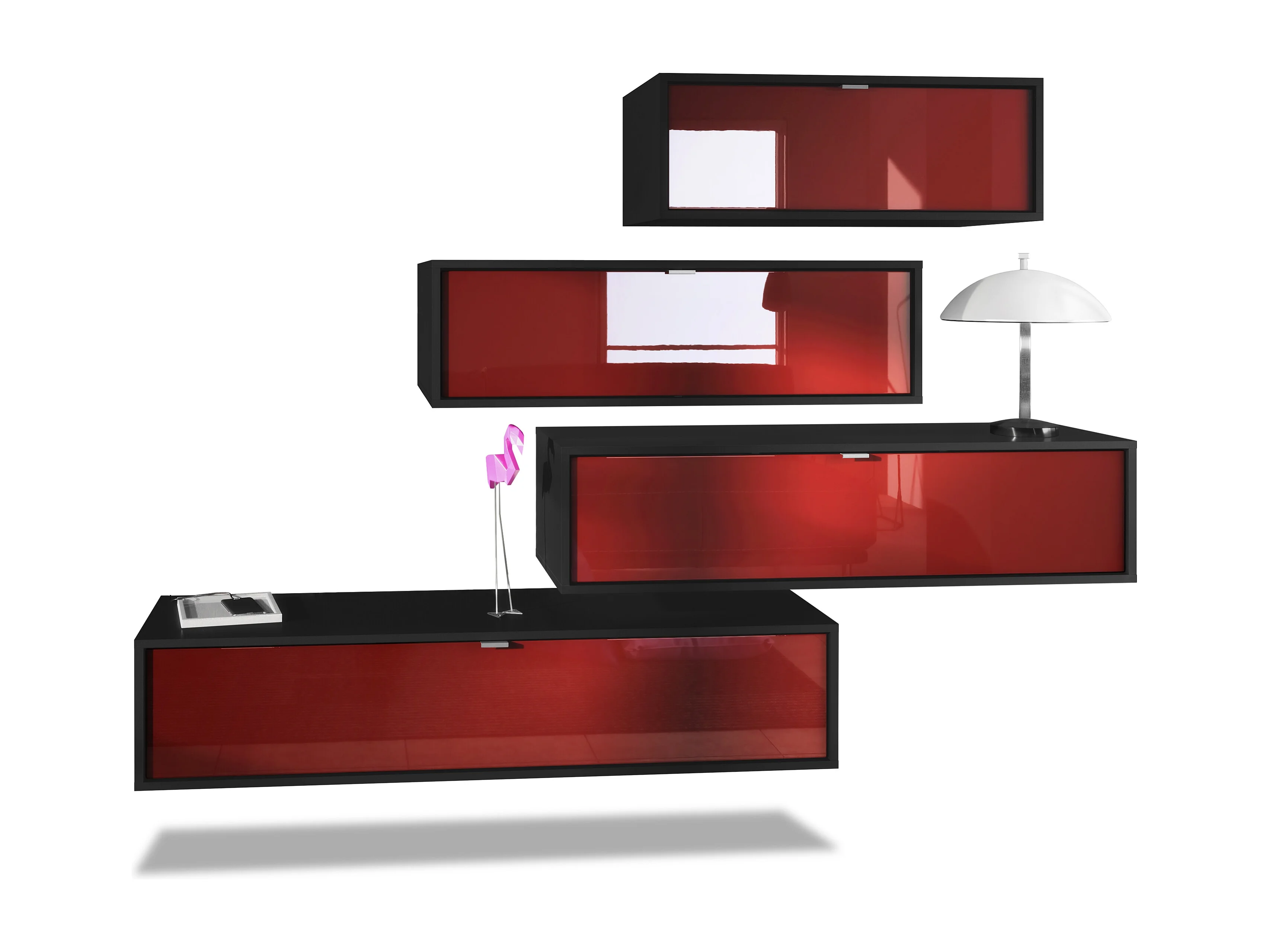 Unité murale Lana V3 composée de 4 unités murales à 10 compartiments, caisson en Noir mat, façades en Bordeaux haute brillance