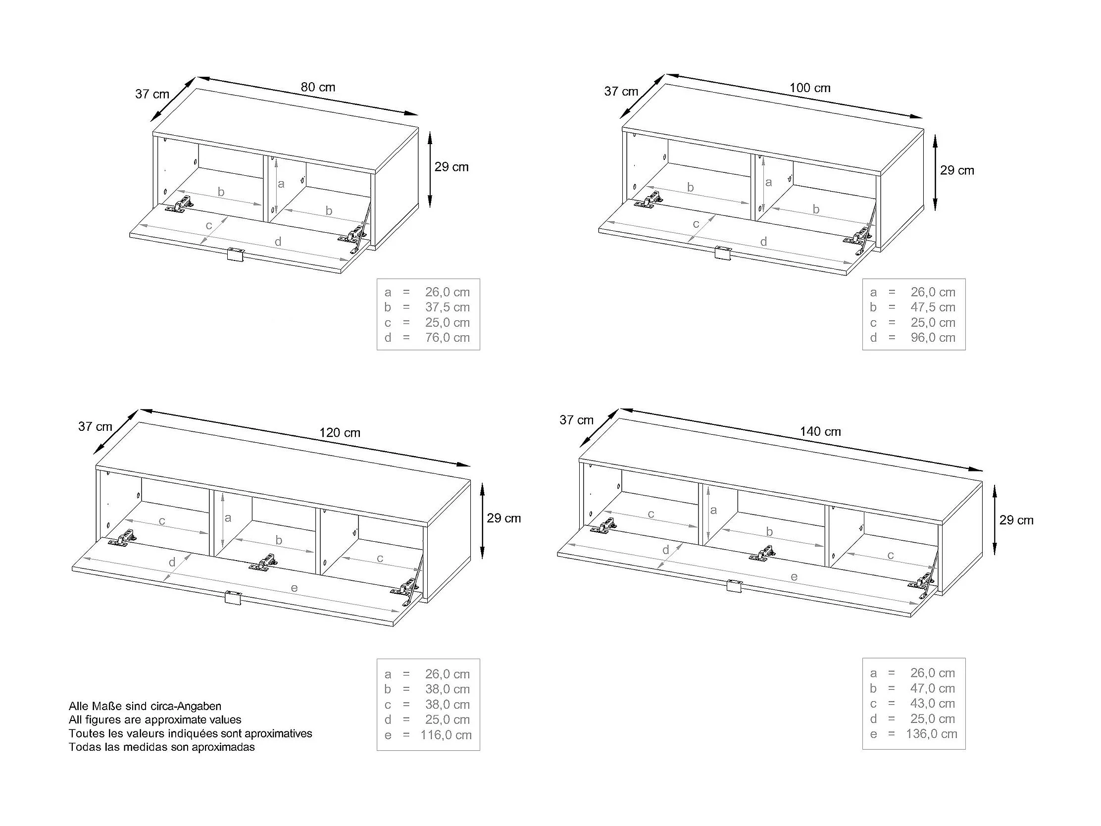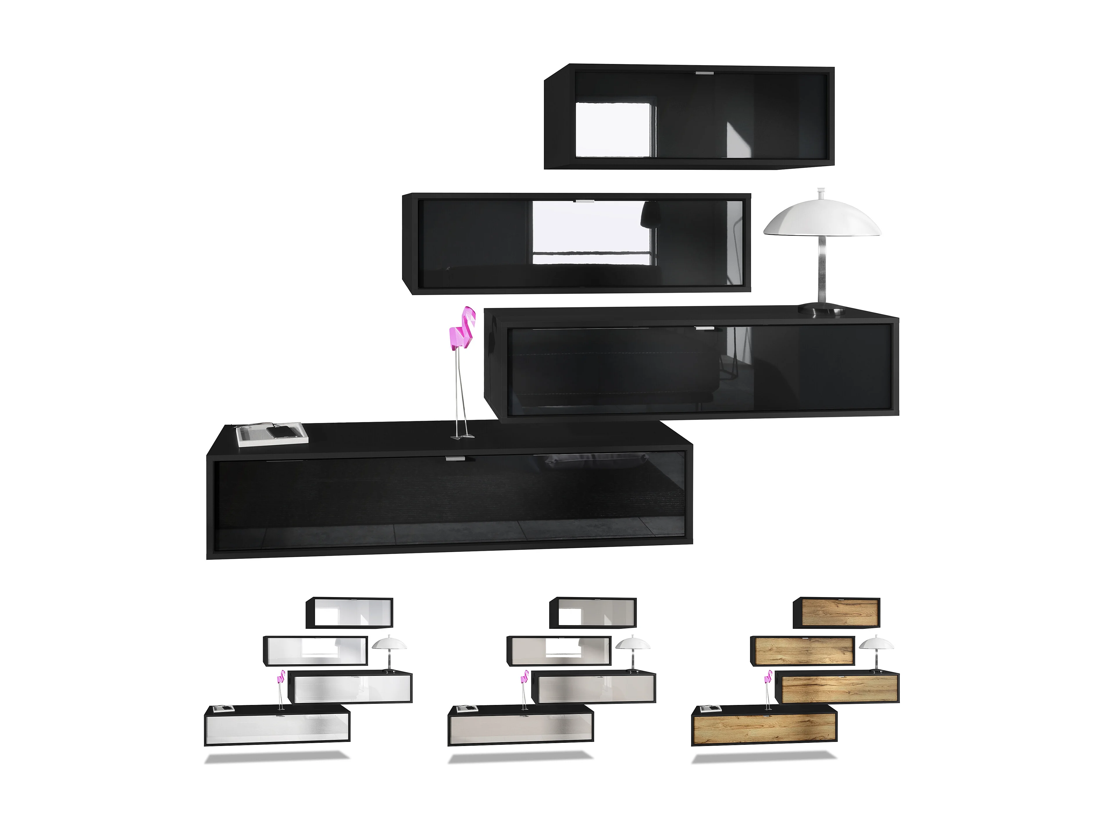 Unité murale Lana V1 composée de 5 unités murales à 12 compartiments, caisson en Noir mat, façades en Bordeaux haute brillance | Grand choix de couleurs