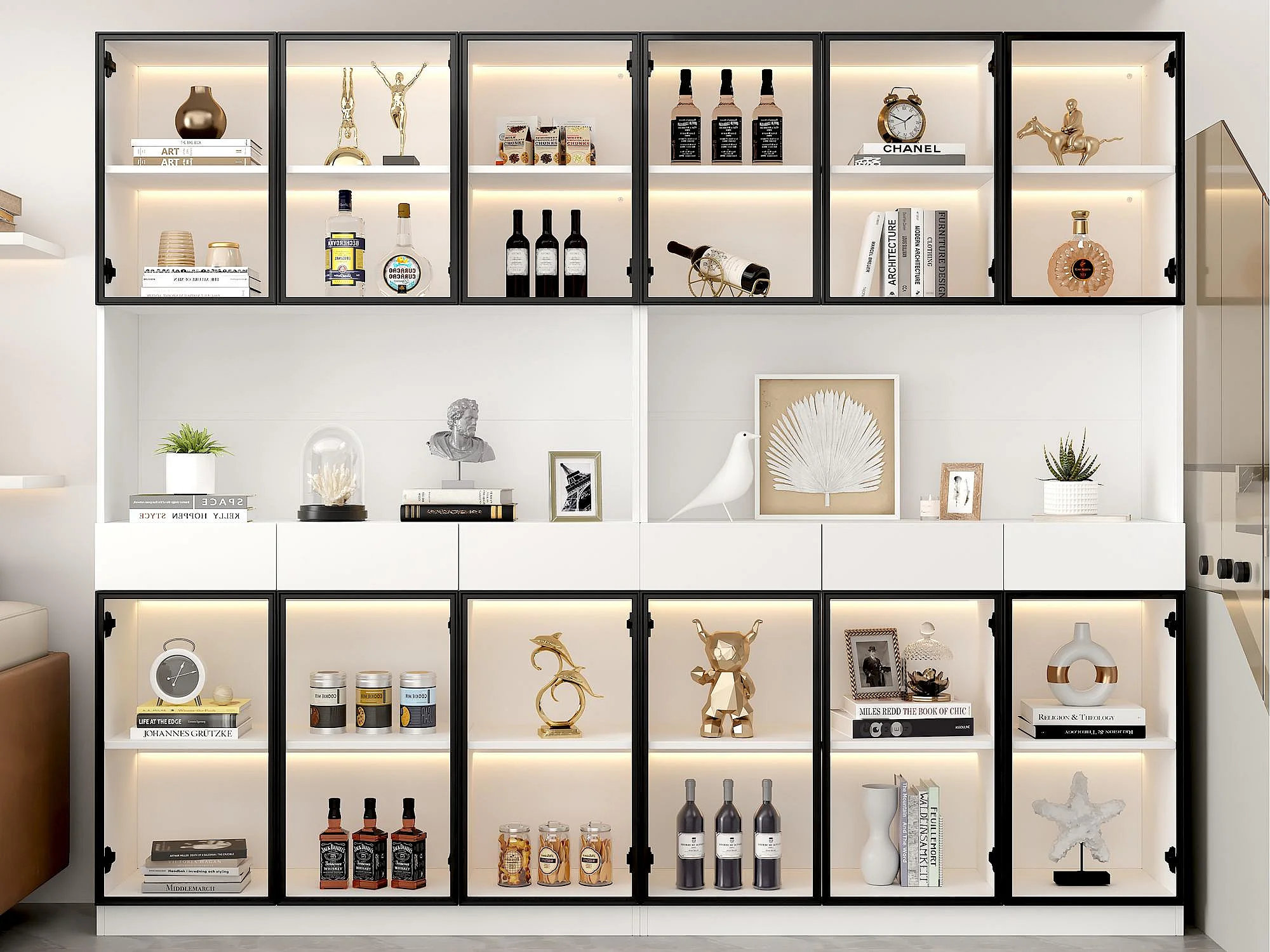 Vitrine avec 8 portes - 160 x 30 x 200 cm - LEDs - Panneaux de particules et verre - Blanc