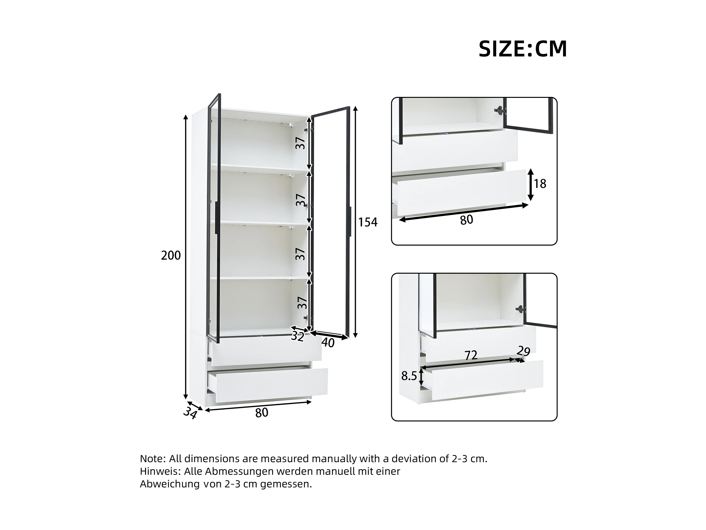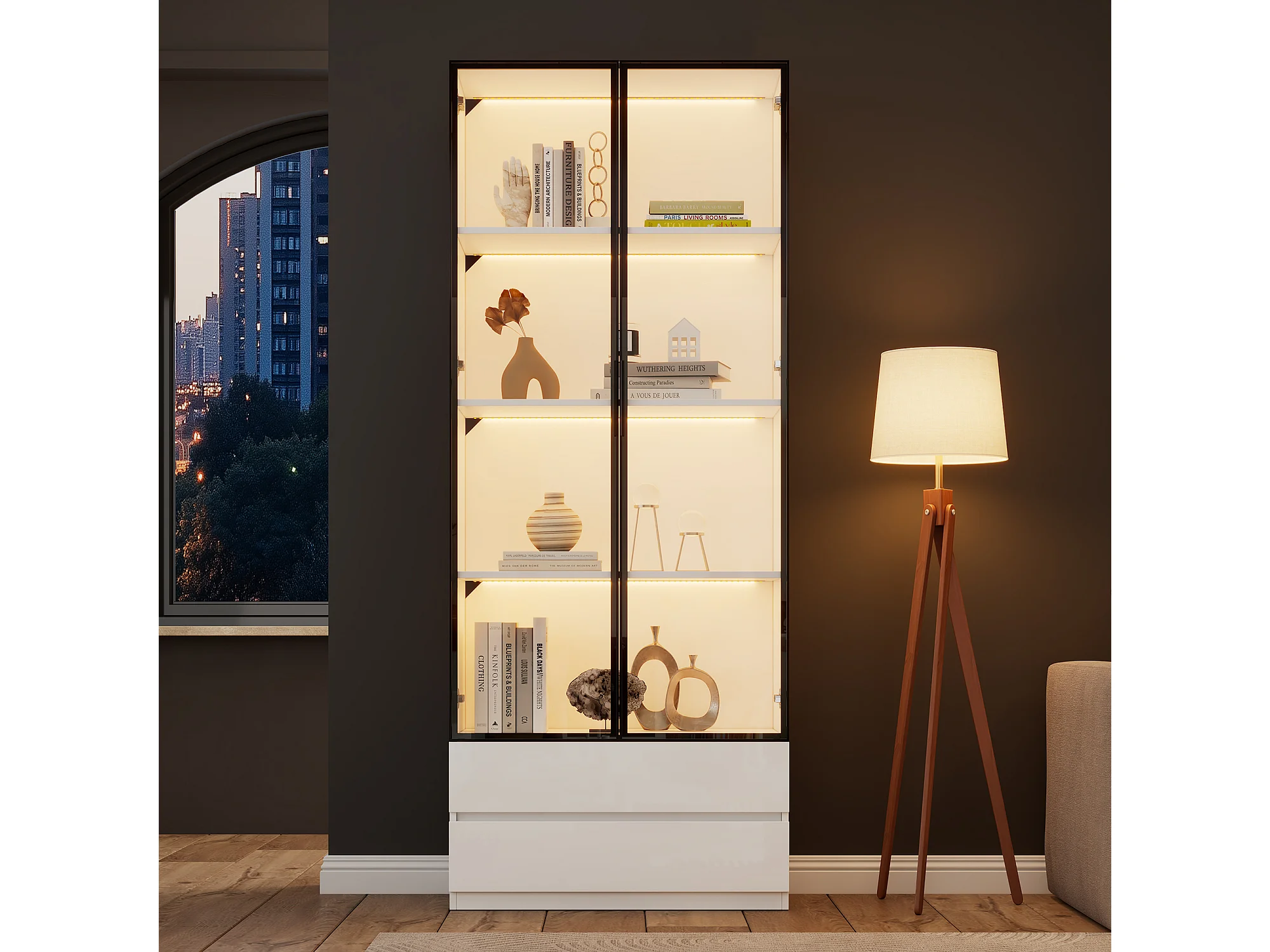 Vitrine 240x36x200 cm avec LED - 12 portes vitrées et 6 tiroirs - Blanc