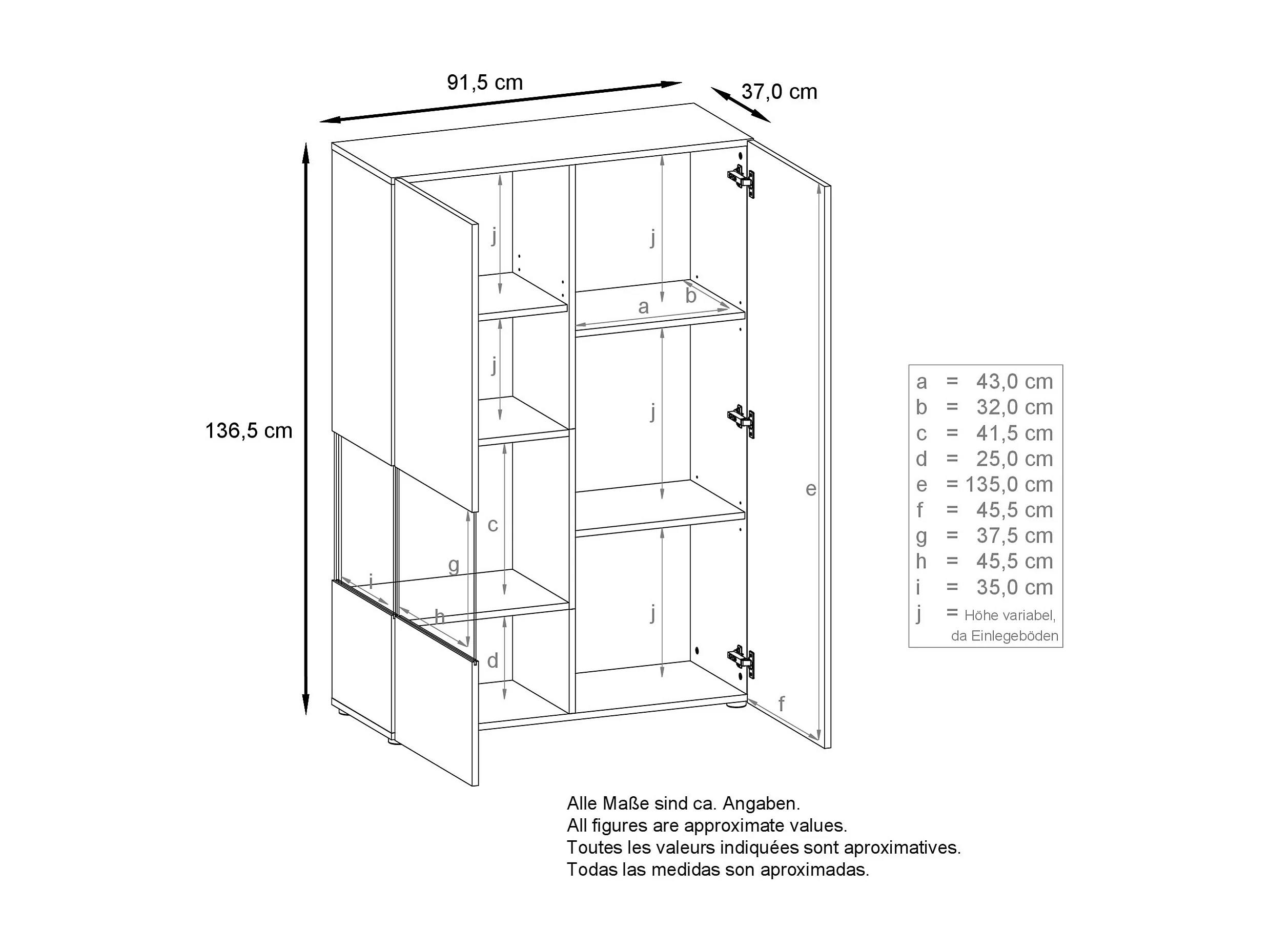 Vitrine Davos, vitrine sur pied avec 3 étagères en verre et 8 compartiments y compris LED, blanc mat/chêne nature (71,5 x 134 x 35 cm)